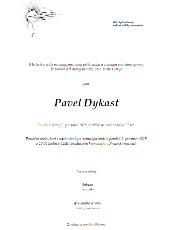 Zemřel Pavel Dykast