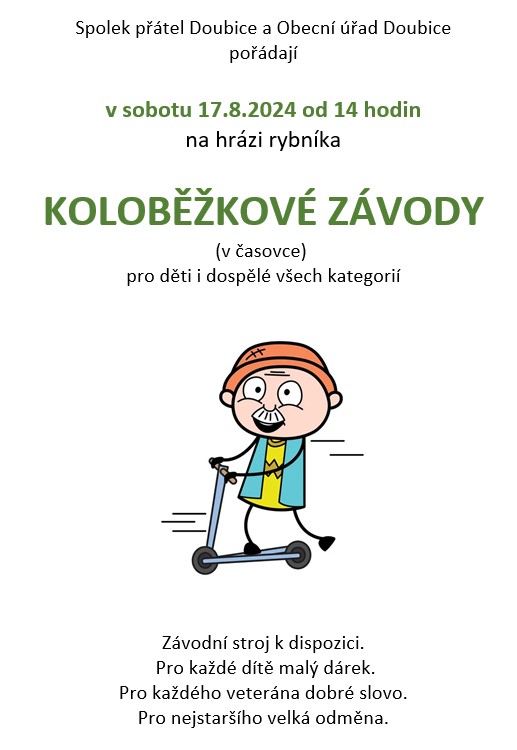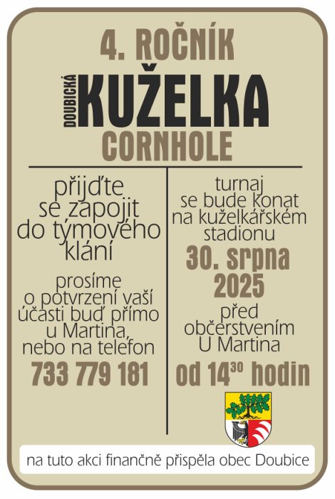 Doubická pouť 2018se koná v sobotu 25.8. od 15 hodin. Sraz je u Penzionu Matyáš a končit se bude u Fabriky. |